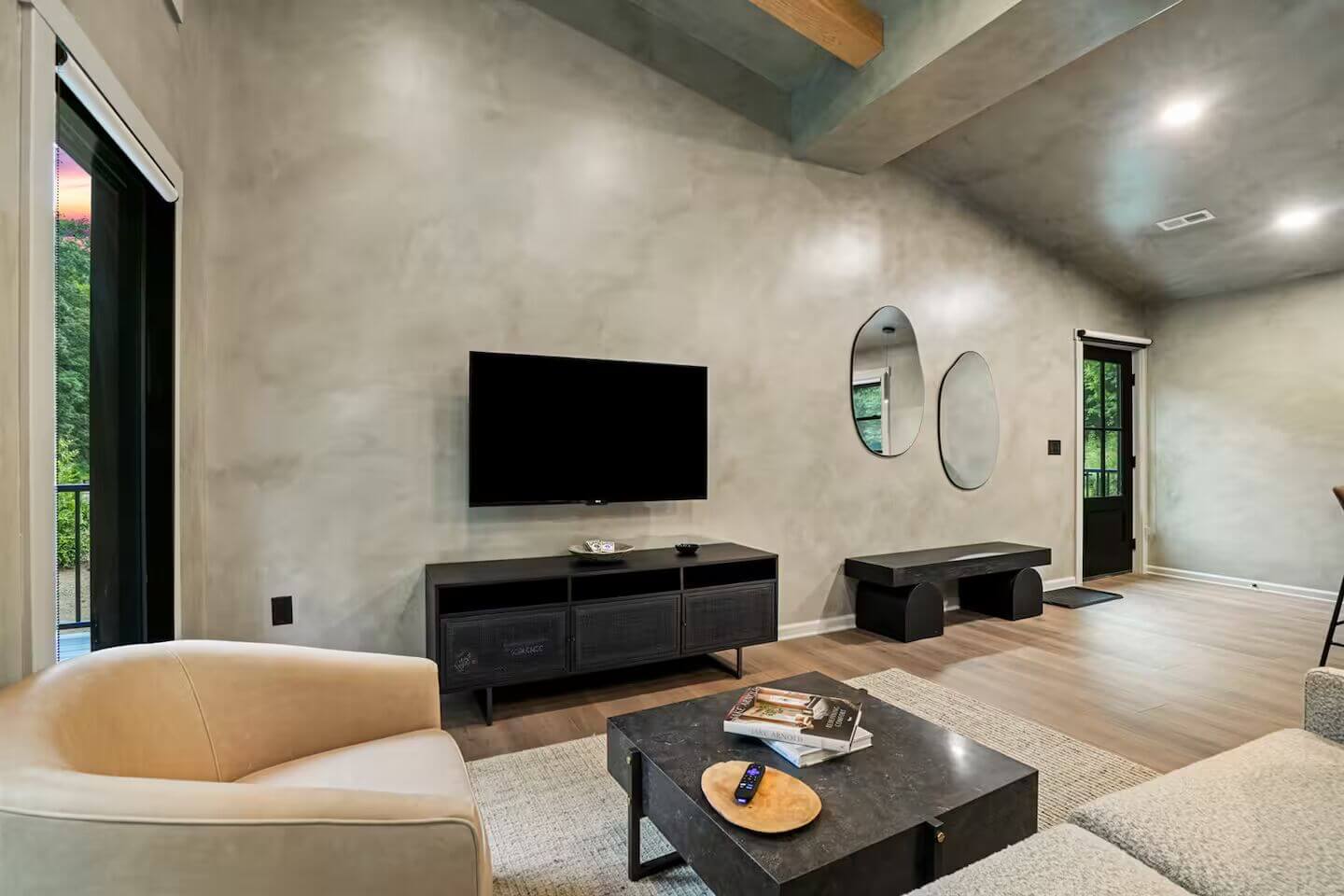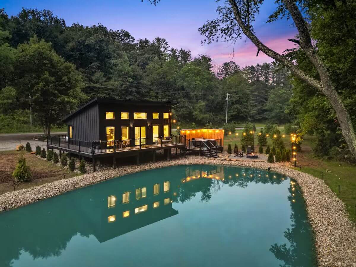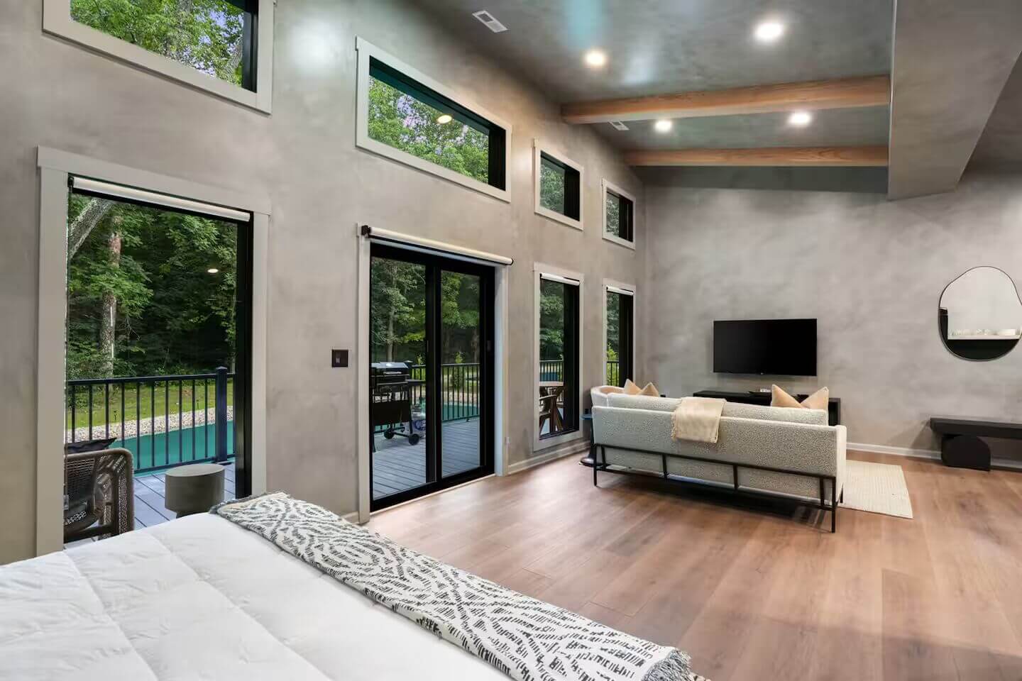 Step inside Siverly Bungalow, a modern and cozy retreat designed for couples looking to relax and reconnect. Large windows bring in natural light and scenic pond views, while stylish finishes and thoughtful amenities create a comfortable stay.